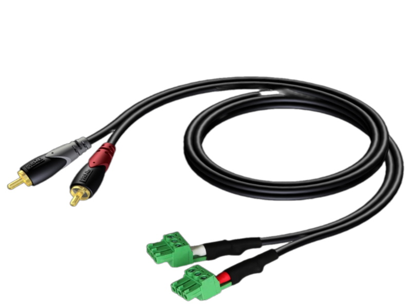 - Кабель оснащён 2 разъёмами RCA/Cinch и 2 клеммными блоками типа Euroblock.