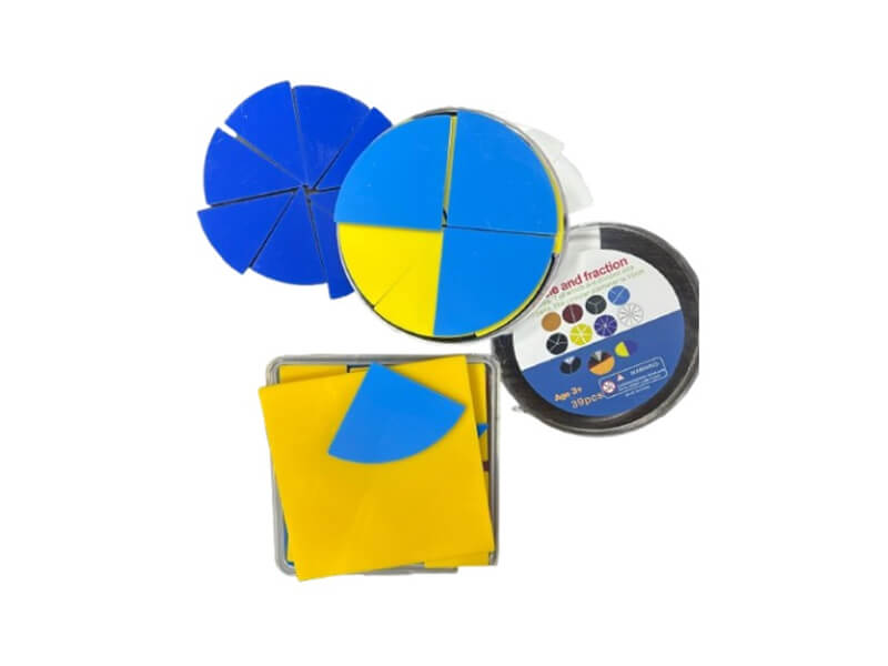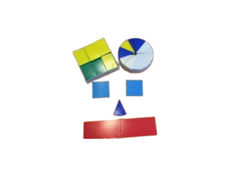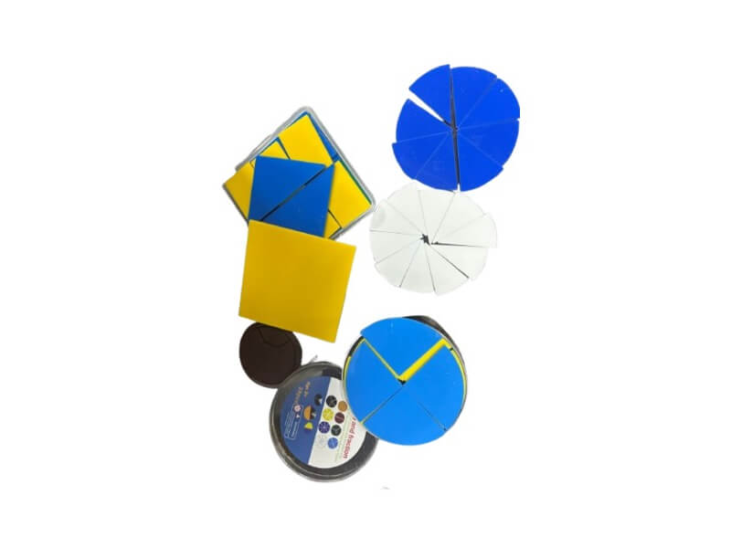 Восемь разноцветных пластиковых кругов диам. 10 см. Один круг – целый, другие разбиты на сектора. Можно работать с дробями со знаменателем 2, 3, 4, 5, 8 и 10. Набор пластиковых пластин квадратной формы, которые могут разделяться на 2, 3, 4 и 6 частей. Деление квадрата на 3 части можно осуществить прямоугольными пластинами или треугольниками; на 4 части – прямоугольниками, квадратами или треугольниками; на 6 частей – только прямоугольниками.