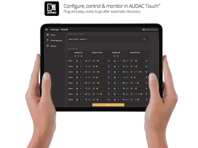 PSQ108 — это интеллектуальный последовательный коммутатор питания с 8 выходами IEC C13, которые можно удалённо включать и выключать через AUDAC Touch™ по соединению TCP/IP или RS-232. Также доступны элементы управления на передней панели для ручного управления. Несколько устройств PSQ108 могут быть соединены последовательно (daisy-chain), что позволяет управлять всеми модулями через один IP-адрес.